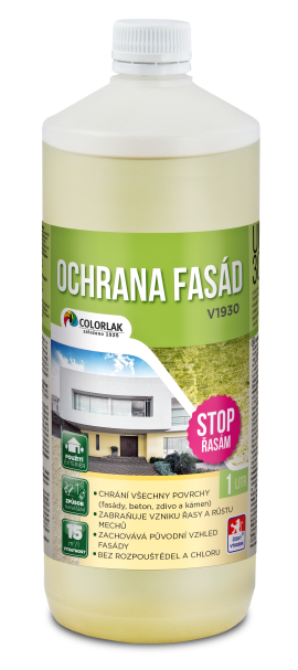 OCHRANA FASÁD V1930 is intended for long-term preventive protection against biological attack (fungi, bacteria, mould, algae and moss) on façades and other mineral surfaces in the exterior, such as plaster, masonry, concrete, stone, roofing. V1930 is intended for direct use, so it is not diluted or otherwise modified. OCHRANA FASÁD serves as a reinforced and longer-term prevention of newly cleaned areas, in synergy with ČISTIČ FASÁDV1920 or diluted ČISTIČ FASÁD KONCENTRÁT V1923, and as a direct prevention against the possible formation of algae, moss, fungi, mould and bacteria at façades in problematic localities such as near the forest, waterways, wetlands, shady places, etc. V1930 does not contain chlorine, does not smell and there is no danger of changing the façade colour shade. The surfaces treated with OCHRANA FASÁD must not get in contact with consumables, feedstuffs and drinking water. The product must not be used for coating of children’s furniture and toys.